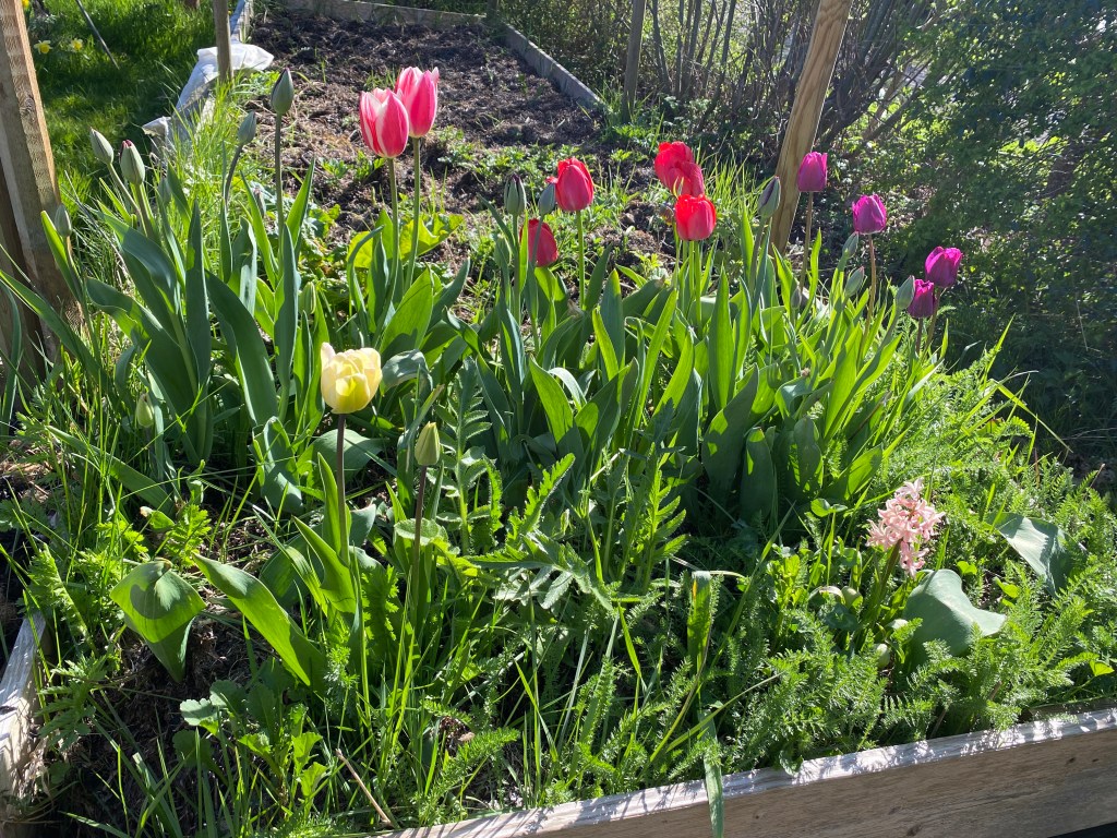 Hon: hoppar raskt från AI till mitt tomatland. Det är inte bara ”sparris-look a like” i det landet utan också en gigantisk tulpan. Vad den gör i min pallkrage kan man ju undra för det första, och för det andra, hur kan den bara bli finare och större för vart år som går. Den har varit ”i vägen” för mina tomater i flera år nu!