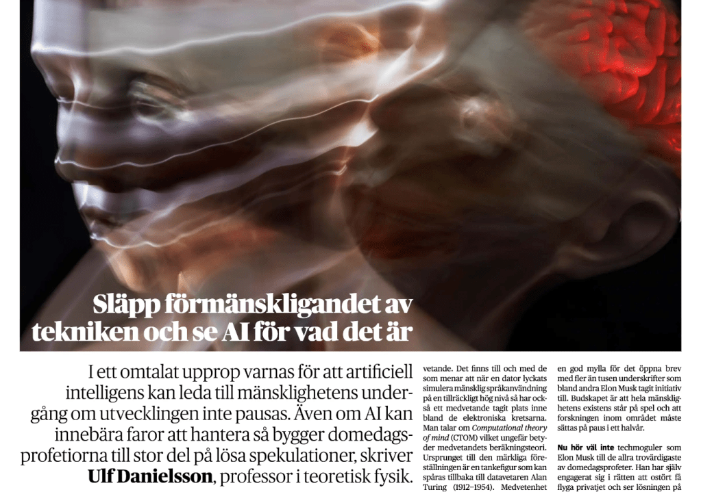 Tänk efter. Vi är mer rädda för att teknikerna håller på att utveckla en art som kanske är intelligentare än vad vi är. Istället borde vi fundera över varför vi som är så smarta tror att vi är odödliga. Släpp förmänskligandet av ­tekniken och se AI för vad det är”, skrev den folkkäre professorn i teoretisk fysik Ulf Danielsson nyligen. ”Det är förlösande att släppa allt detta förmänskligande av tekniken och se AI för vad det är: ett kraftfullt och möjligtvis revolutionerande tekniskt hjälpmedel på gott och ont. Som ångmaskinen eller elden före den. Det gäller att göra bruk av det på sätt som gagnar oss. En av de allra största riskerna med den digitala utvecklingen har vi nog också redan sett prov på. Vi fördummas av de ständiga distraktionerna och tränar oss inte i att tänka.”