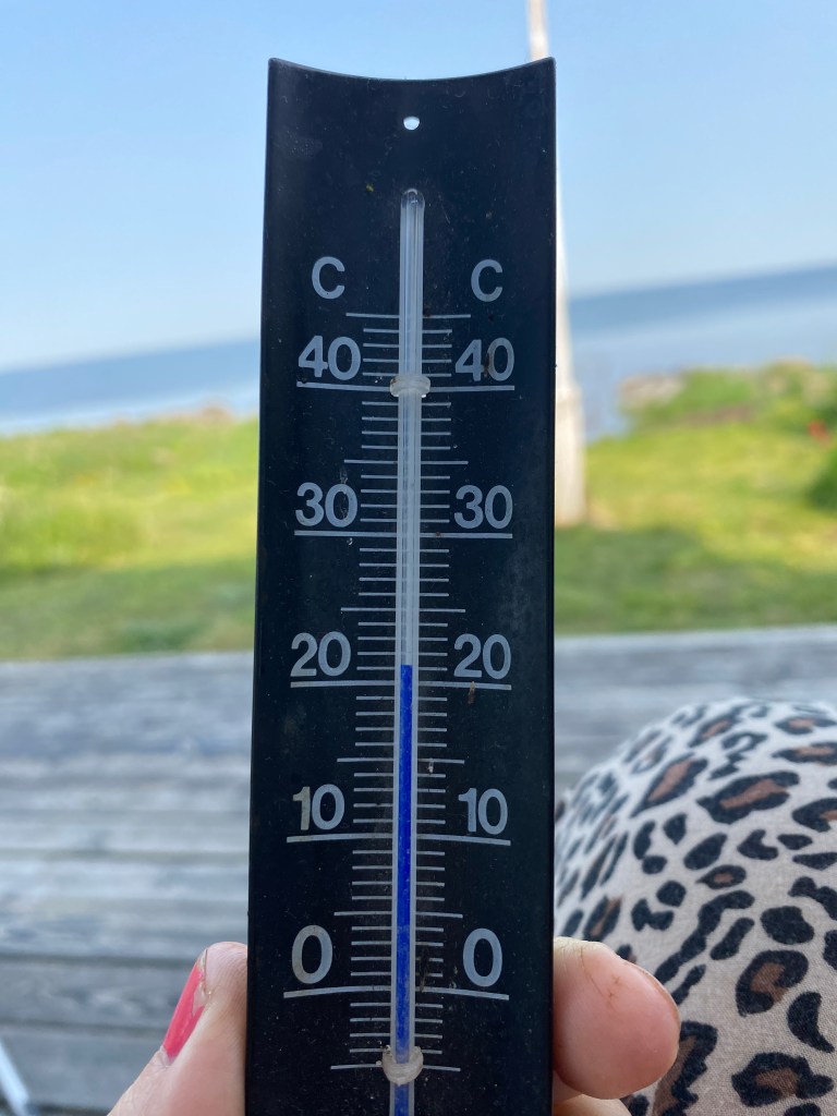Hon: första kvällen på skuggsidan mot havet. Det är fortfarande drygt 21 grader. Så skönt! Och han har åkt till Norrland, där det ska vara typ sex grader, på klassåterträff. Pilutta dig säger jag bara!