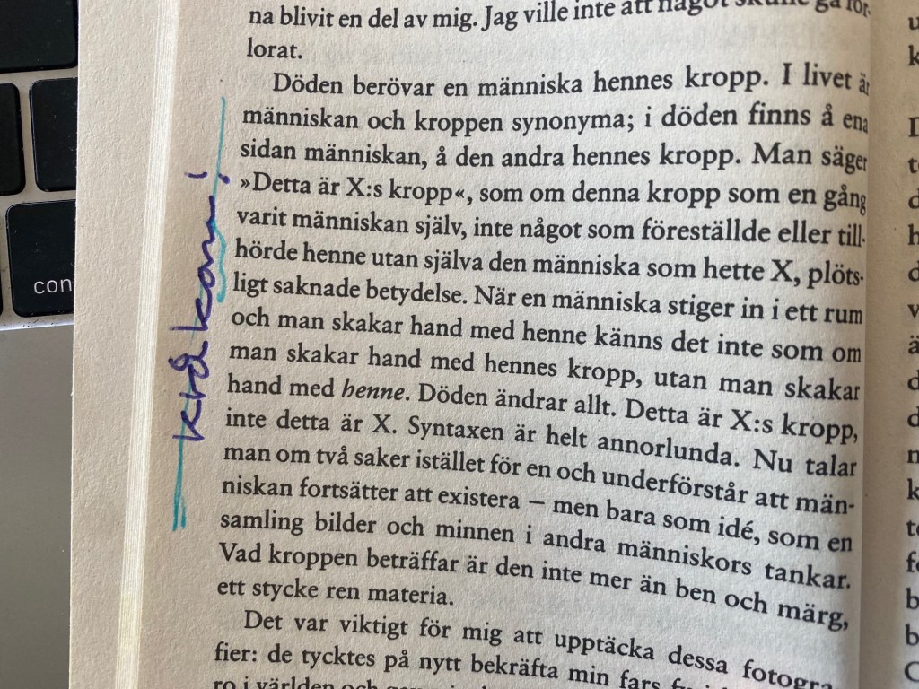 I livet är en människa och hennes kropp samma sak. När vi skakar hand med någon hälsar vi på henne, inte på hennes kropp. ”Men döden ändrar allt”, konstaterar Paul Auster (Att uppleva ensamhet, En bok för alla, 1982). ”Detta är X:s kropp, inte detta är X. Syntaxen är helt annorlunda. Nu talar man om två saker istället för en och underförstår att människan fortsätter att existera – men bara som idé, som en samling bilder och minnen i andra människors tanker. Vad kroppen beträffar är den inte mer än ben och märg, ett stycke ren materia”.