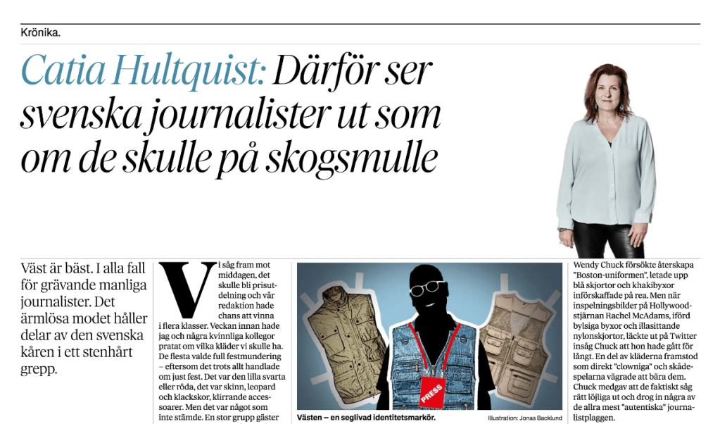 Och vittnar om att i hennes bransch är västen inte bara är ett praktiskt gubbattribut: ”I min bransch är den framför allt en seglivad, ålderslös identitetsmarkör. Särskilt för män tycks den livsviktig. Och särskilt för grävande sådana.”
