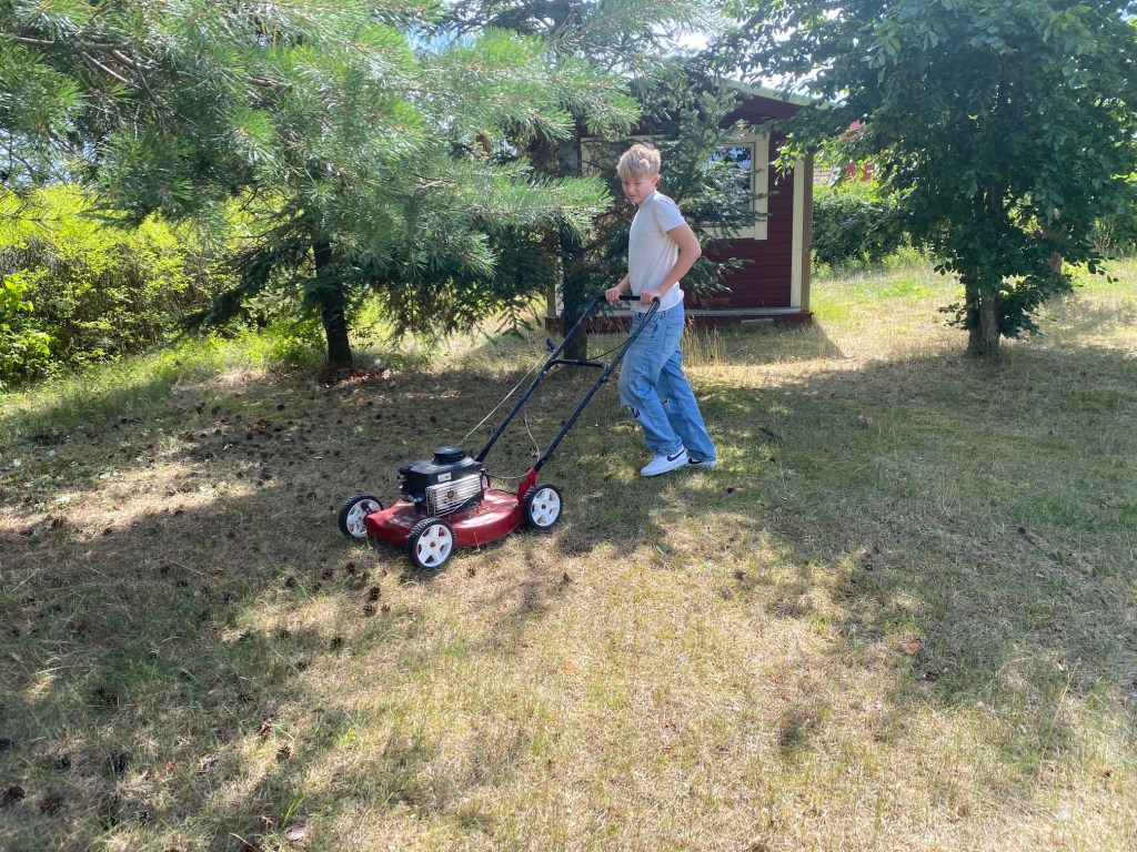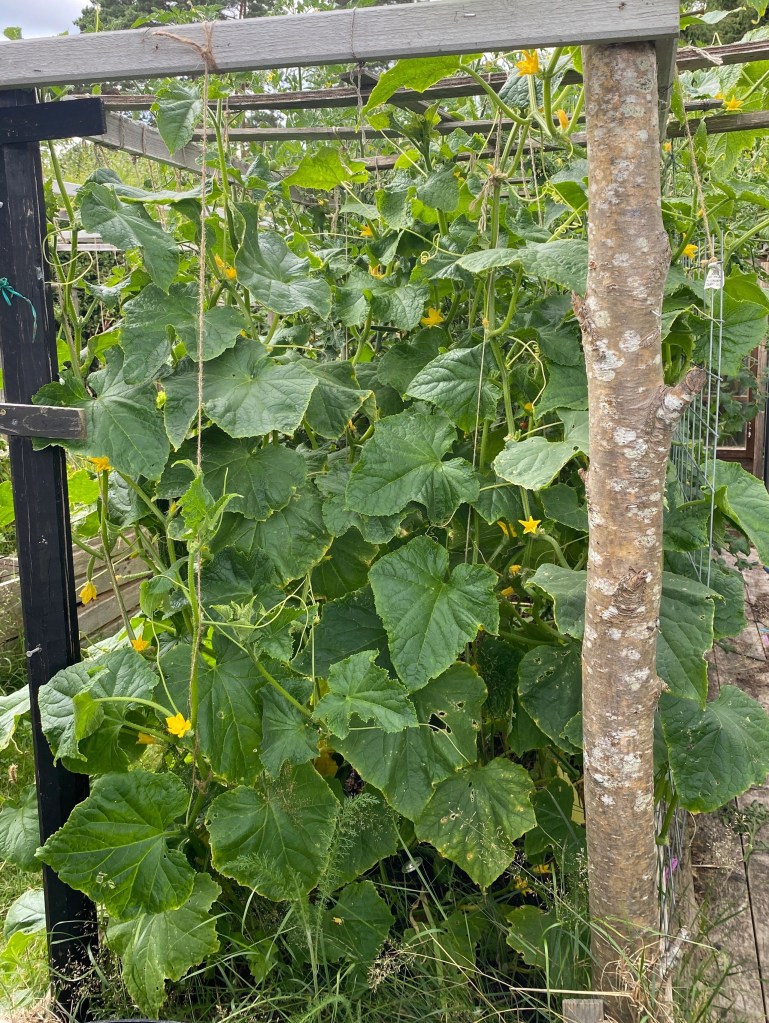 Hon: fortsätter försöka få ordning på odlingarna. Tog bort sista fiberduken i gurklandet. Jodå, den behövs nog fortfarande eftersom det är halv storm hela tiden… men tror ändå att de behöver släppas fria. Det är trångt om saligheten.