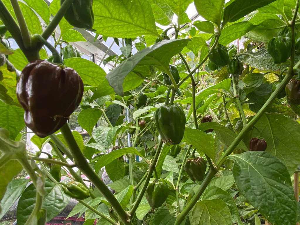 Men det gömmer sig fina gurkor i gyttret! Och i växthuset, bakom en massa förvuxna tomatplantor står en superfin planta översållad med chilin Chocolate Bonnet. Så god, och så stark! Den är jag väldigt glad för. Förra året blev det röda Habaneros av fröerna, någon hade varit otrogen…