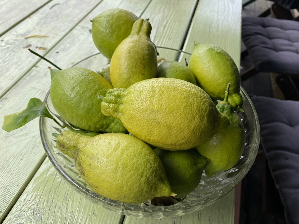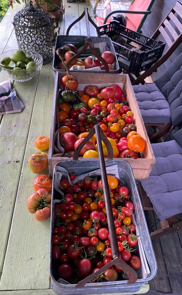 Plockade först av en del av citronträdets citroner så inte grenarna går av i stormbyarna, samt skördade så många tomater jag orkade. Borde ut och ta flera, även de halvmogna…