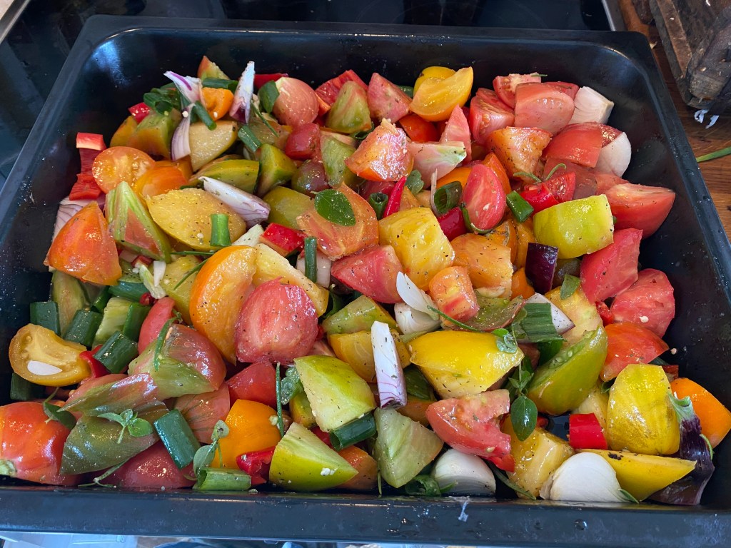 Men först frysa in de mogna små så de inte blir dåliga. Sen in med en plåt med de stora tillsammans med lök, chili, örter, vitlök och paprika. Och så lite olja och vinäger på det.