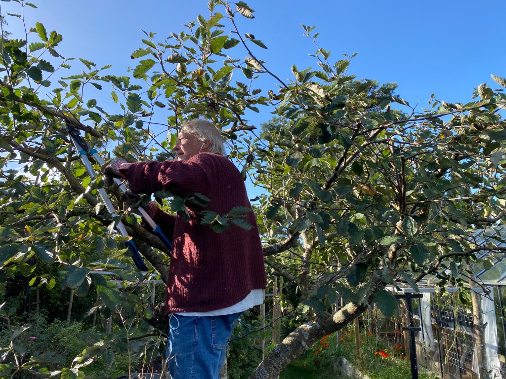 Hon: han skulle egentligen börja bloggen idag men jag tränger mig före med något mer lättsamt, trädbeskärning i halv storm :). Dagens dagsverke.