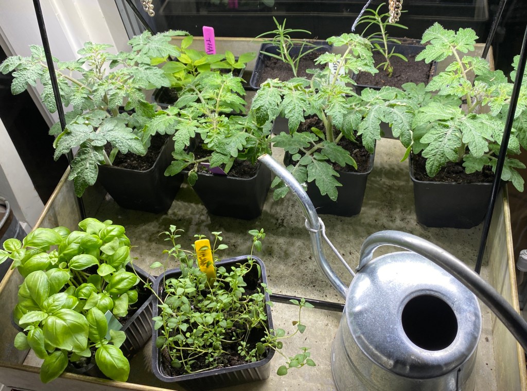 Två olika små microdwarfar (dvärgtomater). Och så lite örter. Basilika, thaibasilika, timjan och skott från rosmarinen.