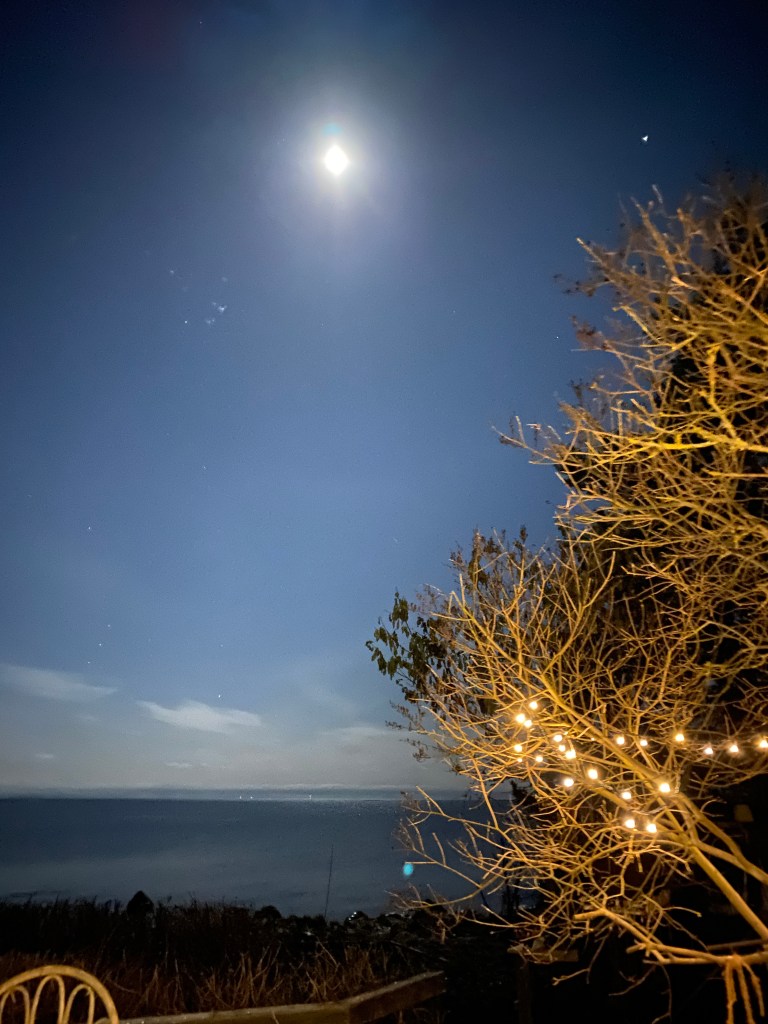 Nu sätter jag mig och väntar på fullmånen som grädde på moset. Igår var det så här vacker himmel när vi kom hem: