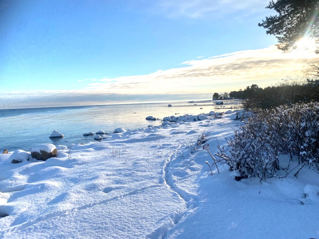 Vilket vi märker vid soluppgång och när solen går ner när snön går i gult, orange, rosa beroende på hur solens ljus bryts i atmosfären. I den del av Norrland där jag kommer ifrån går snön ofta i blått, särskilt när himlen är klar och solen skiner.
