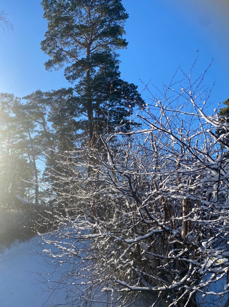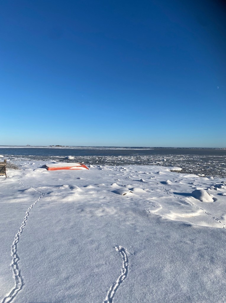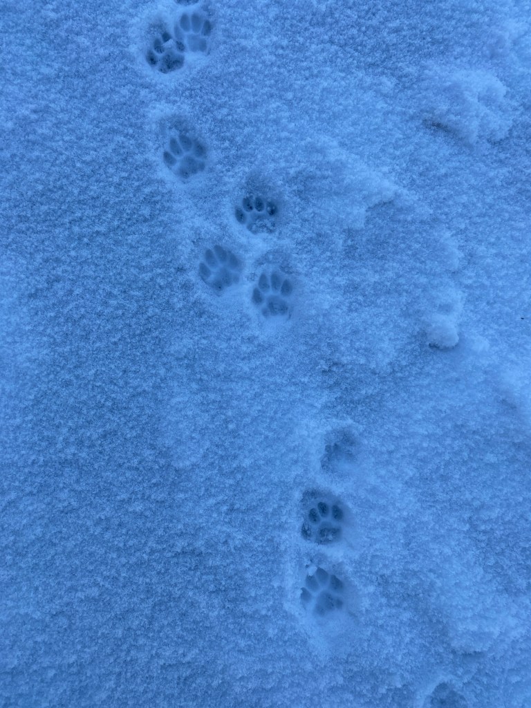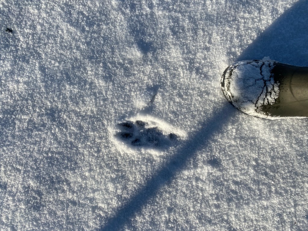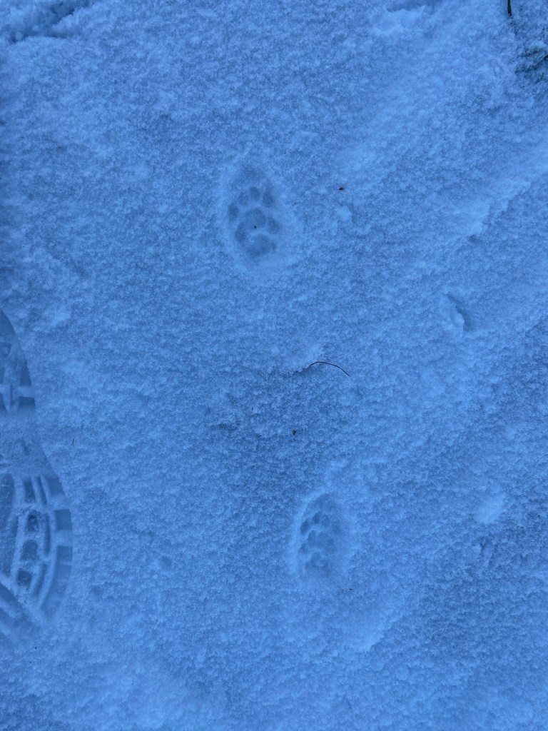 Hon: för djup snö på delar av östersjöleden mellan oss och Södra Kärr, blev en ganska lång promenad runt Skeppevik och Järnsida istället. Kollade in spår i snön: