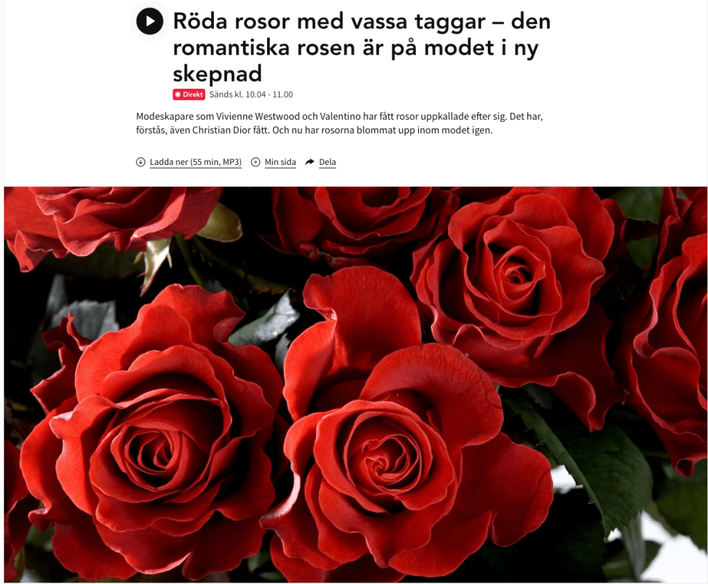 Inte undra på att jag har svårt för att plocka upp min egen palett. Nöjer mig med att lyssna på Susanne Ljung och Stil, som i helgen ägnas den röda rosen i mode, dikt och konst.