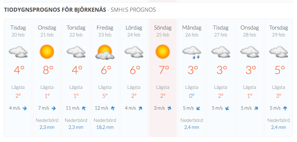 Återkommer i morgon. Enligt SMHI:s 10-dygnsprognos blir det kanske sol.
