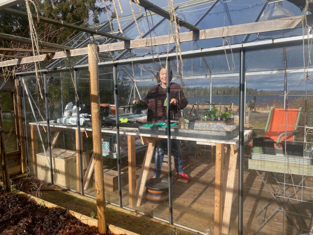 Han: Idag kom solen och udden förändrades. Hon har arbetat hela dan i växthuset och katterna sover inte längre bort dagarna.