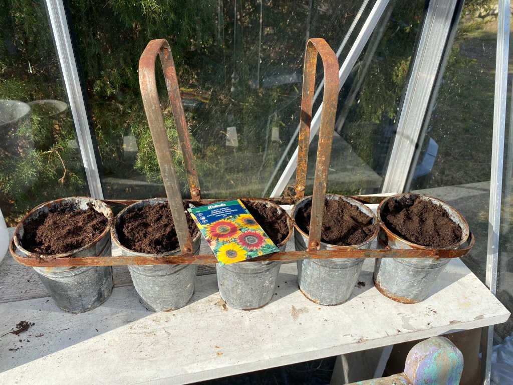 Satte några solrosor också. I krukorna som jag brukar ha kryddor i. Kunde ju bli kul med en i varje, eller så flyttar jag ut dem på friland sen om det blir för trångt i de relativt små krukorna.
