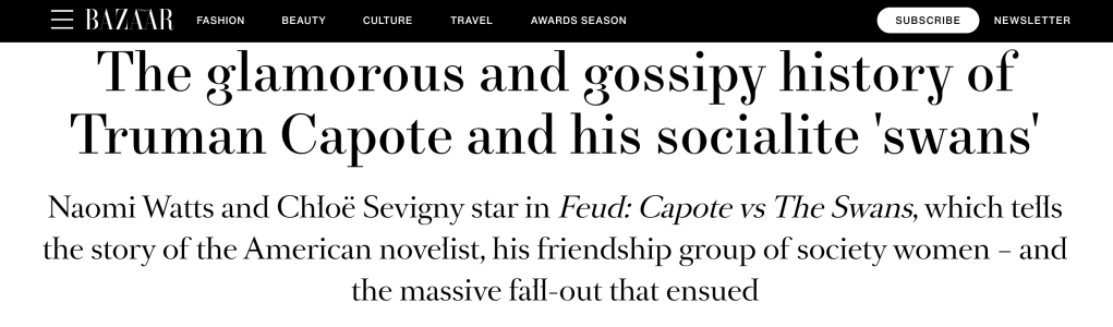 Som du förstår pratar jag inte svanarna på udden. Jag syftar förstås på ”The Swans”, kvinnorna som författaren Truman Capote älskade och som älskade honom. Innan de slutade med det, när han klädde av dem i sin episka berättelse om Amerikas överklass (Answered prayers, Bönhörd).