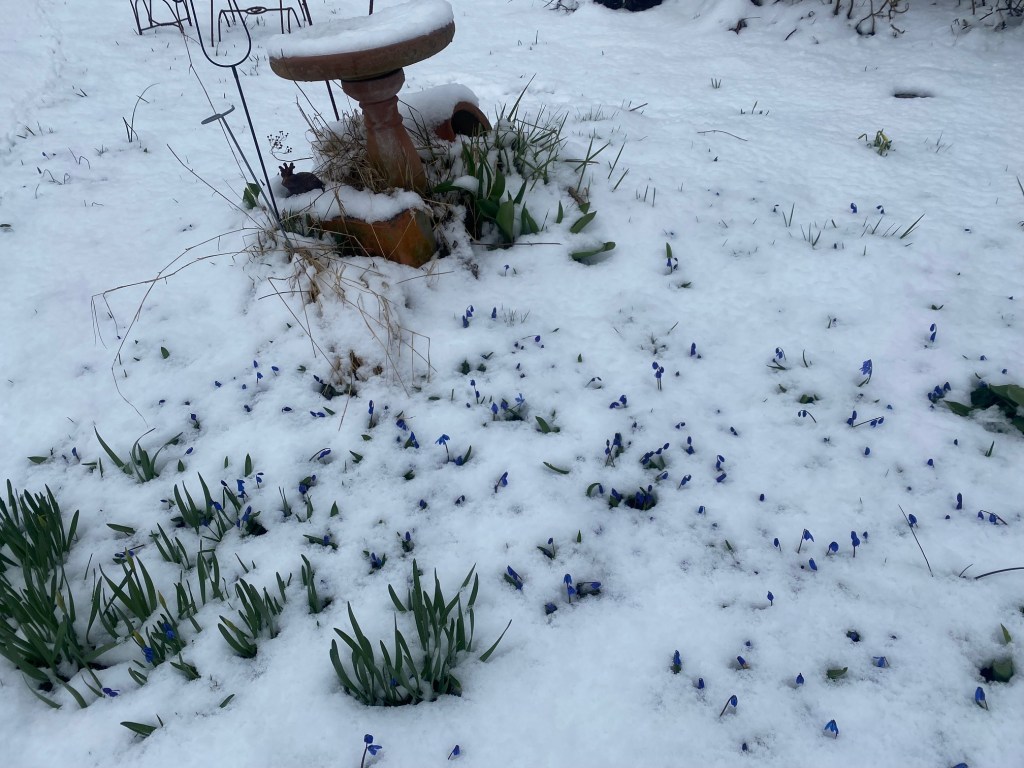Han: Dålig tajming kanske, eller så är det som det brukar vara. Aprilvädret till trots hopar sig vårtecknen under snön – scillan är redan här,