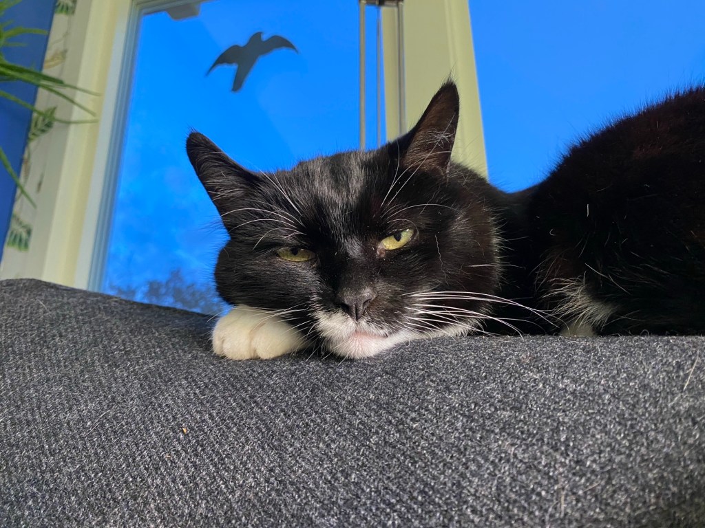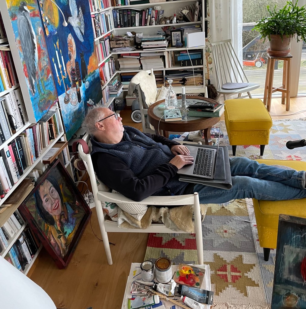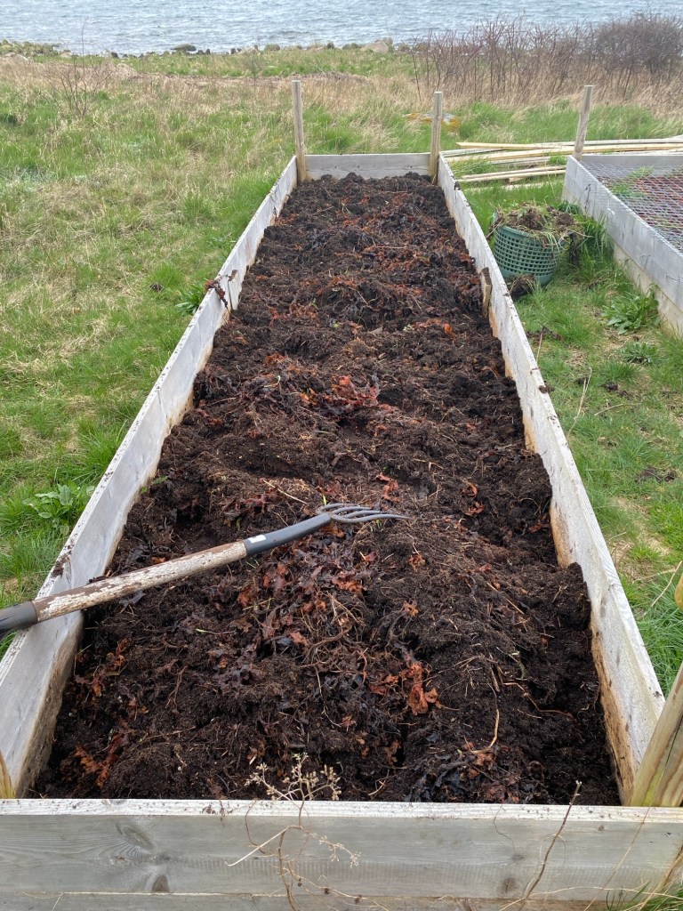Hon: Frukost ute i solskenet efter frostnatt (hade värmefläkt på i växthusen, pust) och ingen vind så riktigt varmt trots endast ett par grader över nollan. Solen värmer nu. Sen blåste det upp och mörka moln fyllde himlen. Åkte och handlade, då kom solen, sen regn, sen… Nä, nu intar vi soffan!