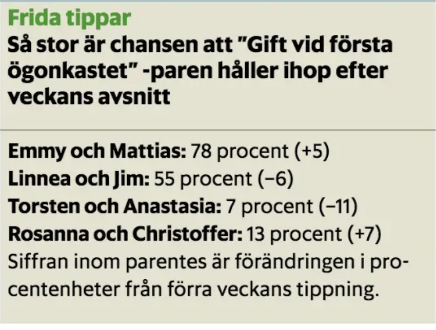Vad gäller den tv-sända kärleken verkar den fungera ungefär lika bra eller dåligt som andra arrangerade äktenskap. Åtminstone om vi ska tro omgivningens skvaller, i tidningarna upphöjd till sportjournalistik