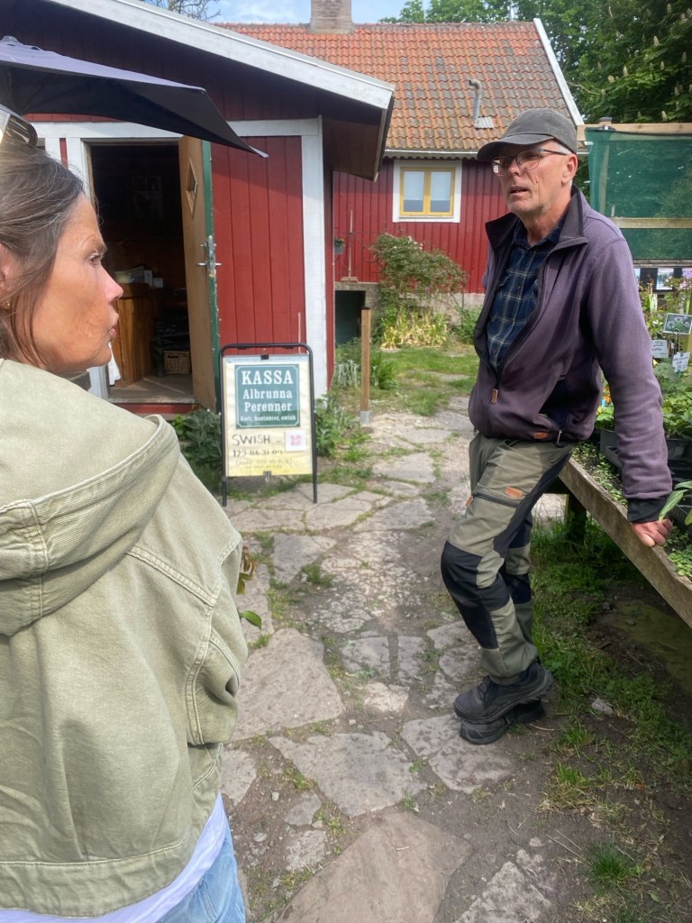 Två klängrosor inhandlades också. På Albrunna Perenner! Där köpte vi vår fina stora mörkrosa ros som står vid köksingången för typ femton år sedan. I vinter har den dock dött, sååå himla tråkigt. Men nu blev det alltså två rosor… hrmmm, var ska vi sätta den andra!!