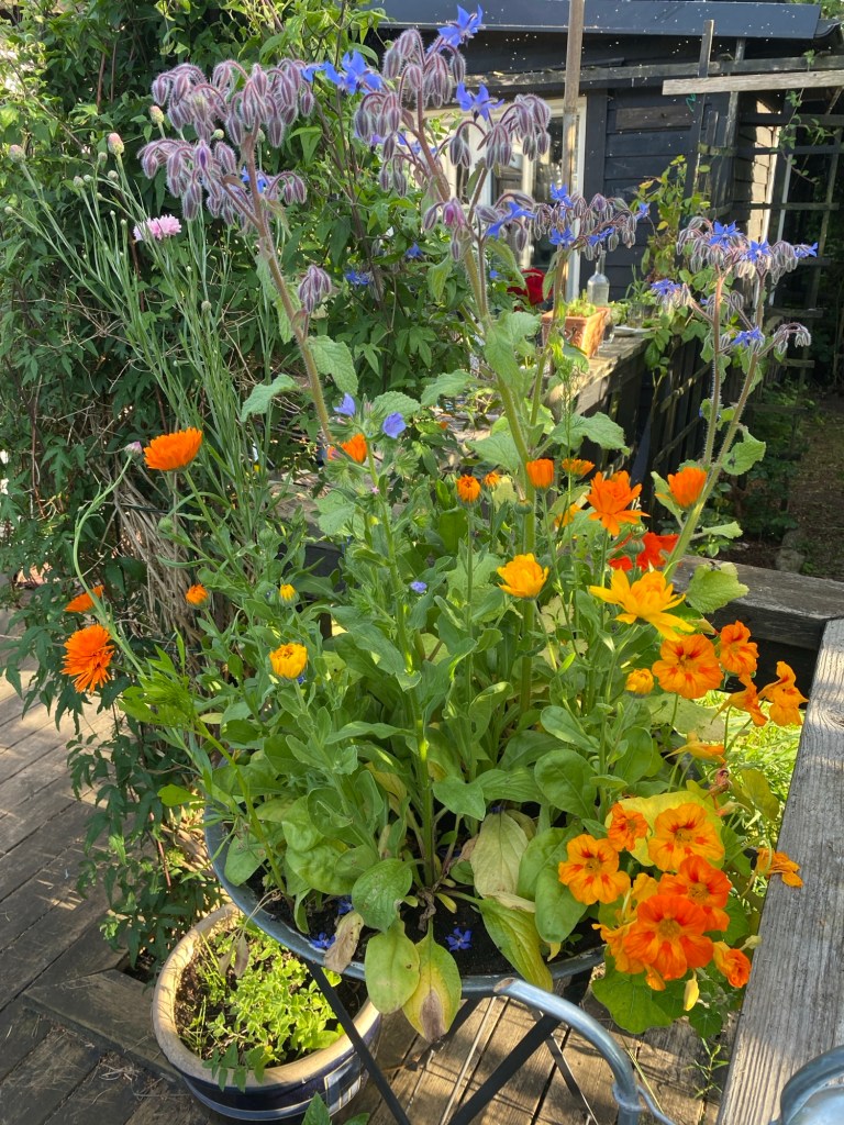 Hon: köpte ett paket fröer med ätbara blommor i våras, satte dem kanske lite tätt, men oj så vackra de är nu när de börjar slå ut. Inte kan jag ta bort de fina blommorna och lägga i en sallad!!