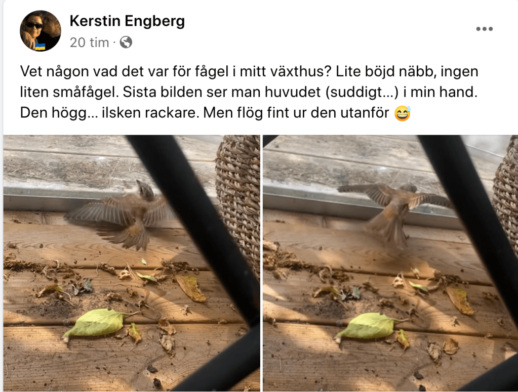 Nu till mysteriet med den okända besökaren. Igår fick hon bevingat besök i sitt växthus: