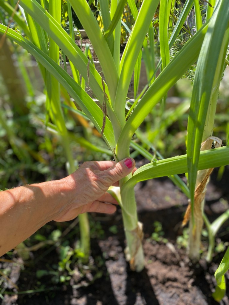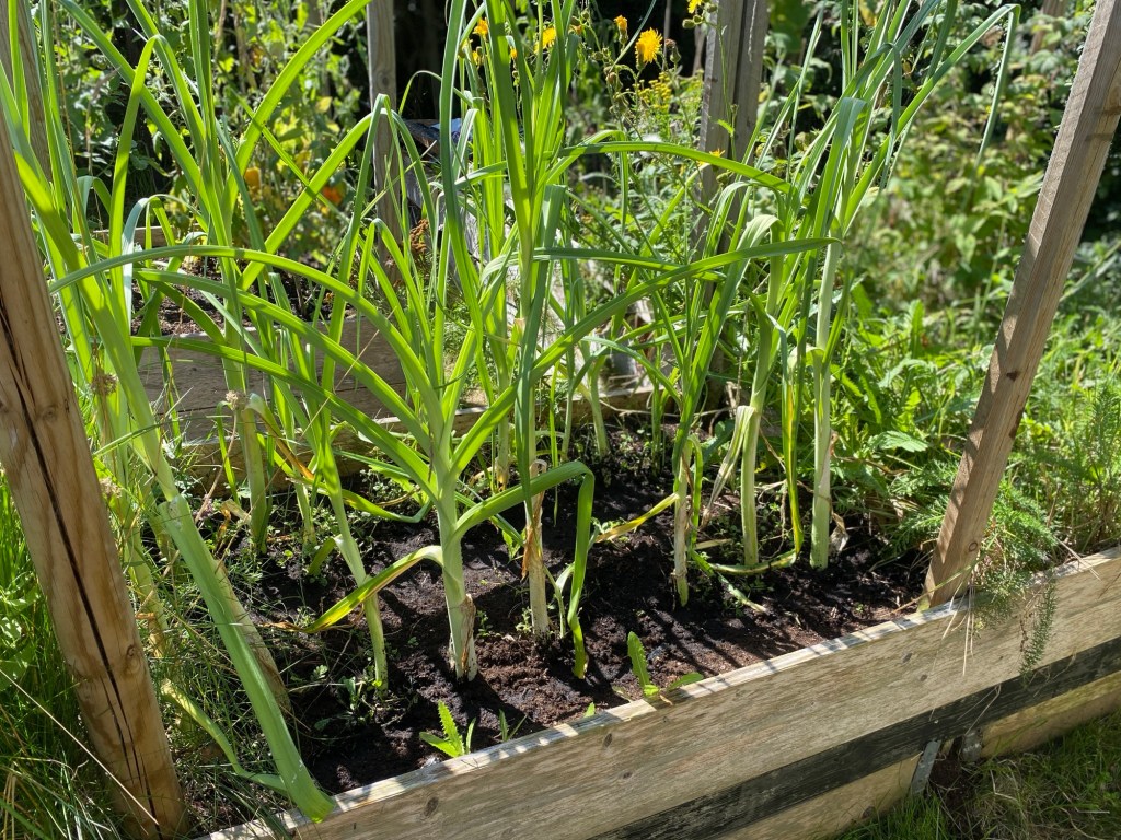 Löken har verkligen grott bra i år, kanske inte vitlöken precis, de flesta blev ganska små. Men de gula och röda är stora och idag skar jag bort den nu torra blasten och la lökarna i en låda. Räcker nog ett tag in på hösten. Och sen blir det purjolök…