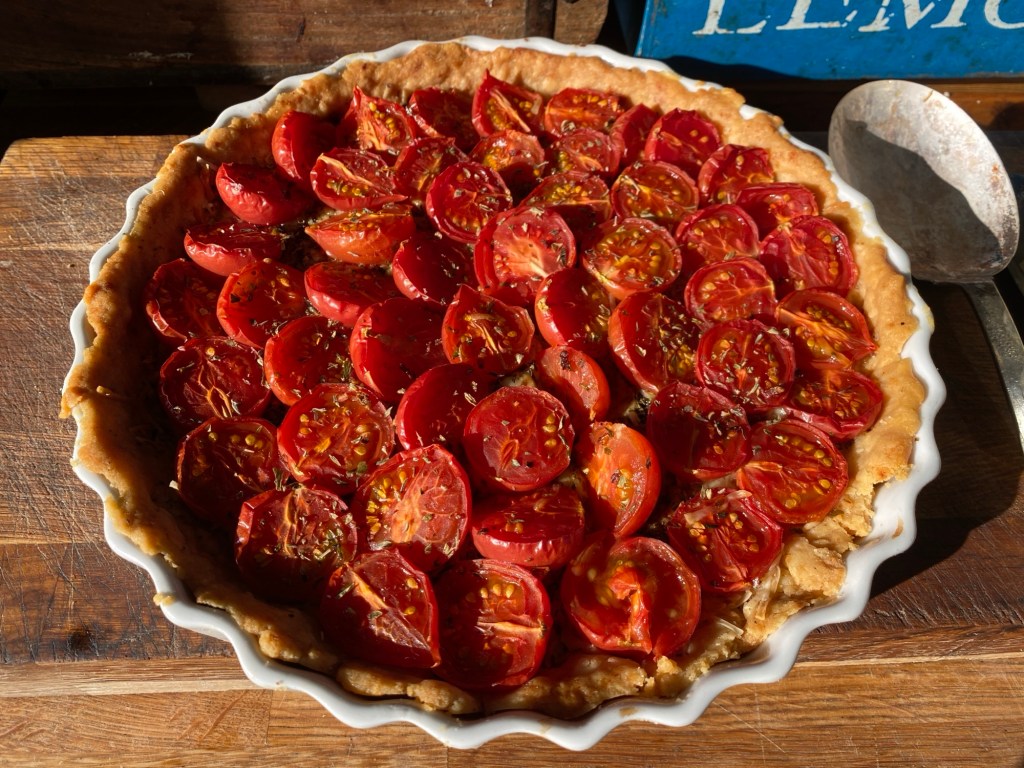 Hon: Gillar när jag kan koka ihop något av det som finns antingen i trädgården eller frysen. Idag blev det en paj på egenodlade tomater och gul lök. Resten av ingredienserna fanns i ”ladorna”. Handlar sällan nu.