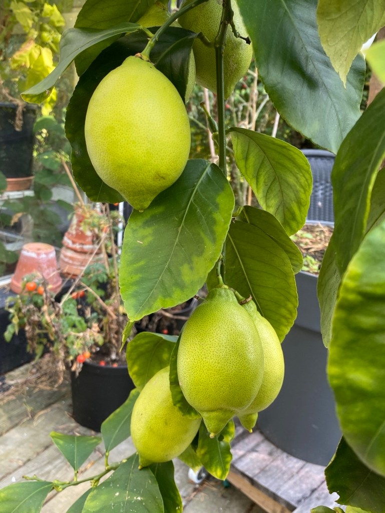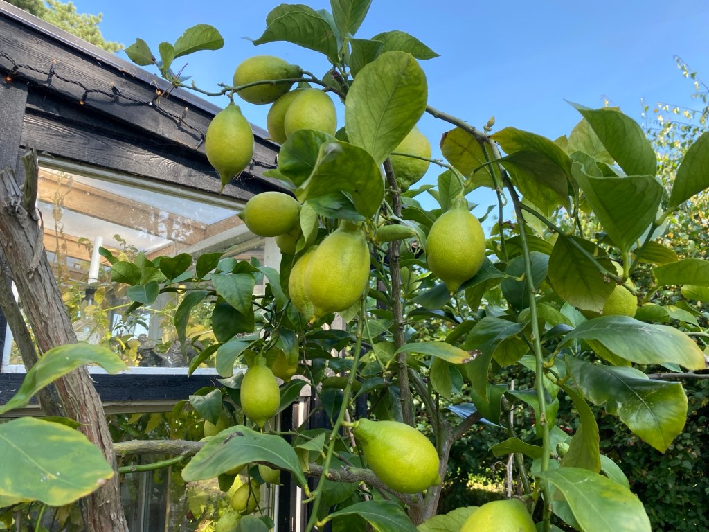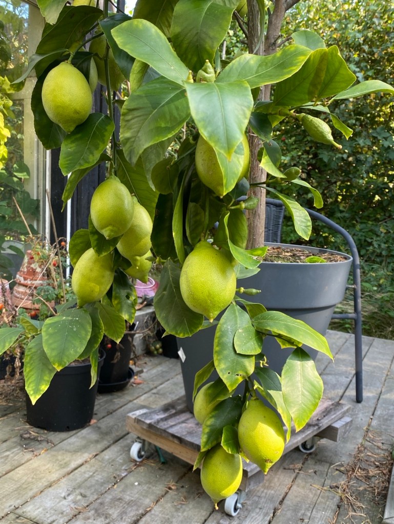 Hon: Citronträdet är nu tungt av mängder citroner. De börjar skifta i gult och är stora och fina, så det är hög tid att skörda och göra årets sats limoncello.