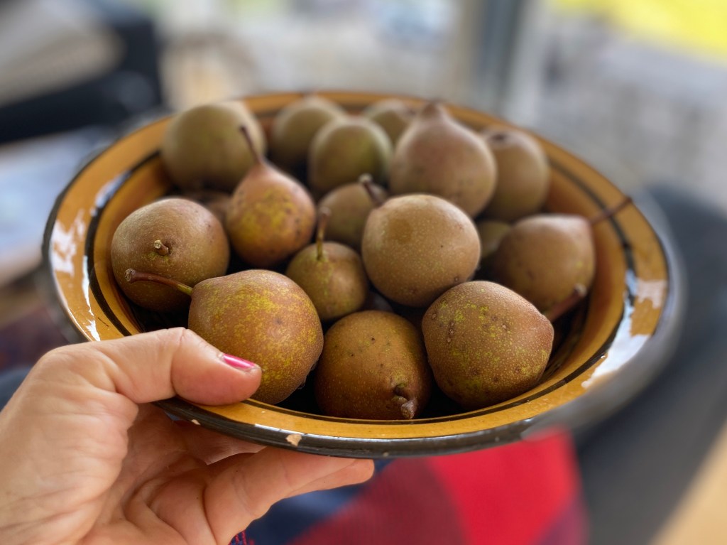 Och så en bild på gråpäronen också. Både krikon och gråpäron är väl ”gamla frukter”, passande ett torp från 1860. Kanske planterades de redan då, päronträdet är i alla fall väldigt mossigt och skruttigt.