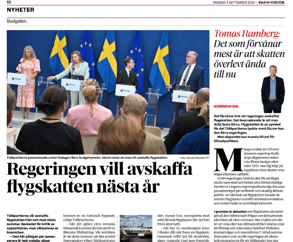 På samma pressträff där den stora tågsatsningen presenterades meddelade regeringen att man tar bort flygskatten.