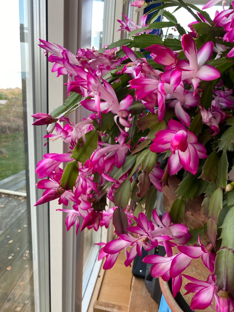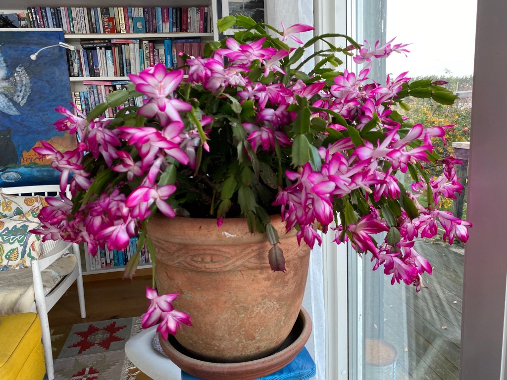 Den brukar blomma lite då och då hela året, inte bara i november, men så kompakt med blommor som nu tror jag aldrig den haft förut. Och det trots att den stått ute på ett undanskymt ställe hela sommaren. Men kaktusar ska ju misskötas.