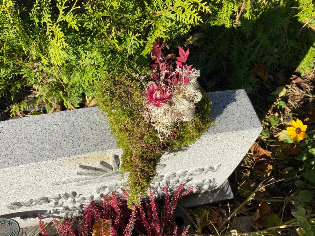 Det lilla hjärtat som vi hade med fick vi sätta ovanpå stenen. Kyrkorådet hade redan lagt en krans och planterat Ljung. Ett litet ljus smög vi in bakom busken. Pyntat var det här!