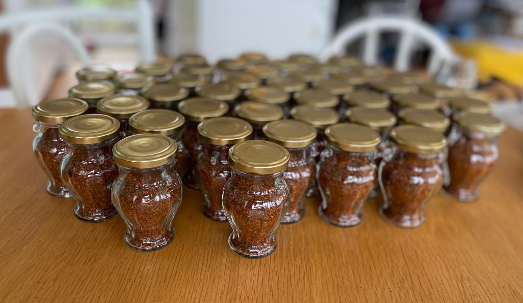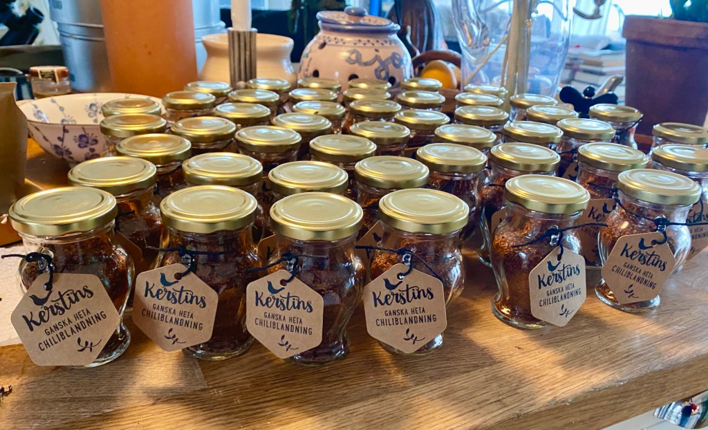 Hon: 46 burkar av den Ganska heta Chiliblandningen blev det i år. Eller lite drygt femtio burkar egentligen, några malde jag tidigt men de försvann snabbt!