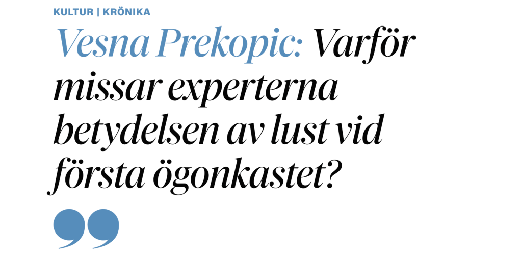 SVT:s koppleriprogram avslutades utan ovationer. I DN ställer Vesna Prekopic den fråga en man i tredje äktenskapet också undrat över: ”Varför tillmäts inte denna attraktion större betydelse i till exempel program som ’Gift vid första ögonkastet’? Visst, attraktion kan byggas upp under tid av en massa olika anledningar, men varför gör experterna samma misstag gång på gång när de agerar som att det inte går att också förutse betydelsen av den i parkonstellationerna?”