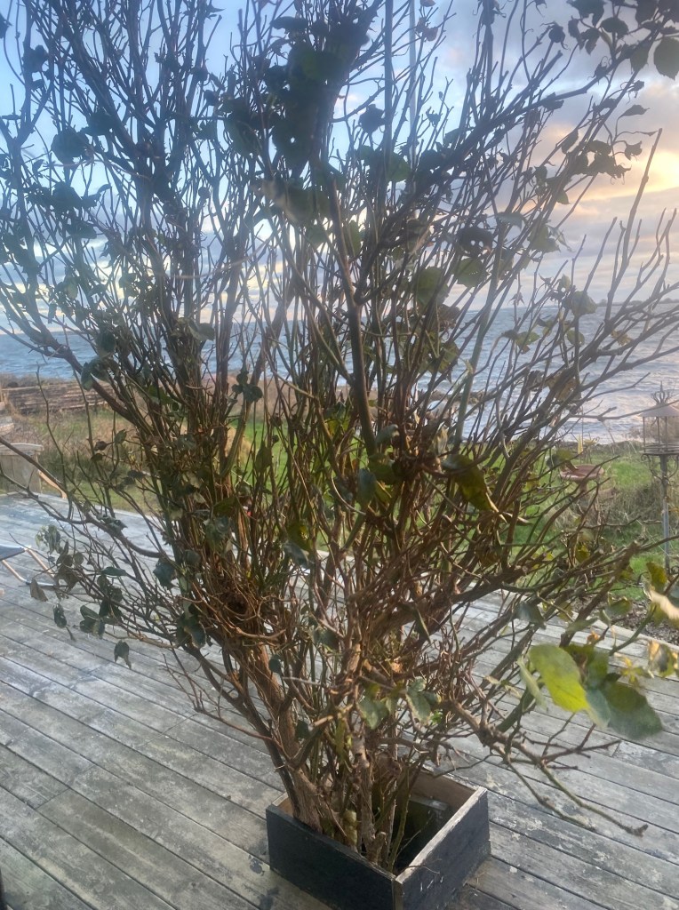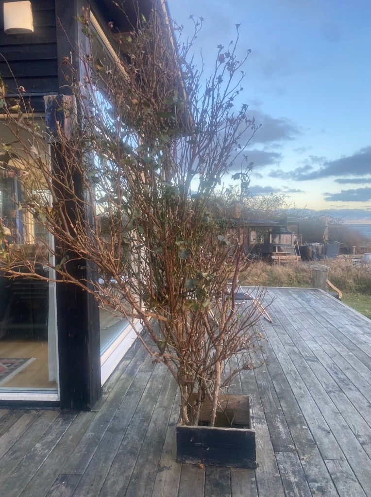 Sant är att hon planterades som buske i skydd av det gamla räcket på verandan mot havet. Men hon överlevde både den gamla verandan och det skyddande räcket och nu står hon solitär en dryg meter från närmaste skydd.