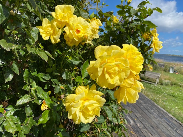 Alla som känner sina rosor vet att Goldstern är en klätterros som även kan användas som buskros. Hon har ett kraftigt växtsätt med tätt fyllda och stora gula blommor som återkommer nästan oavbrutet från midsommar till långt in i november (13 nov här på udden).