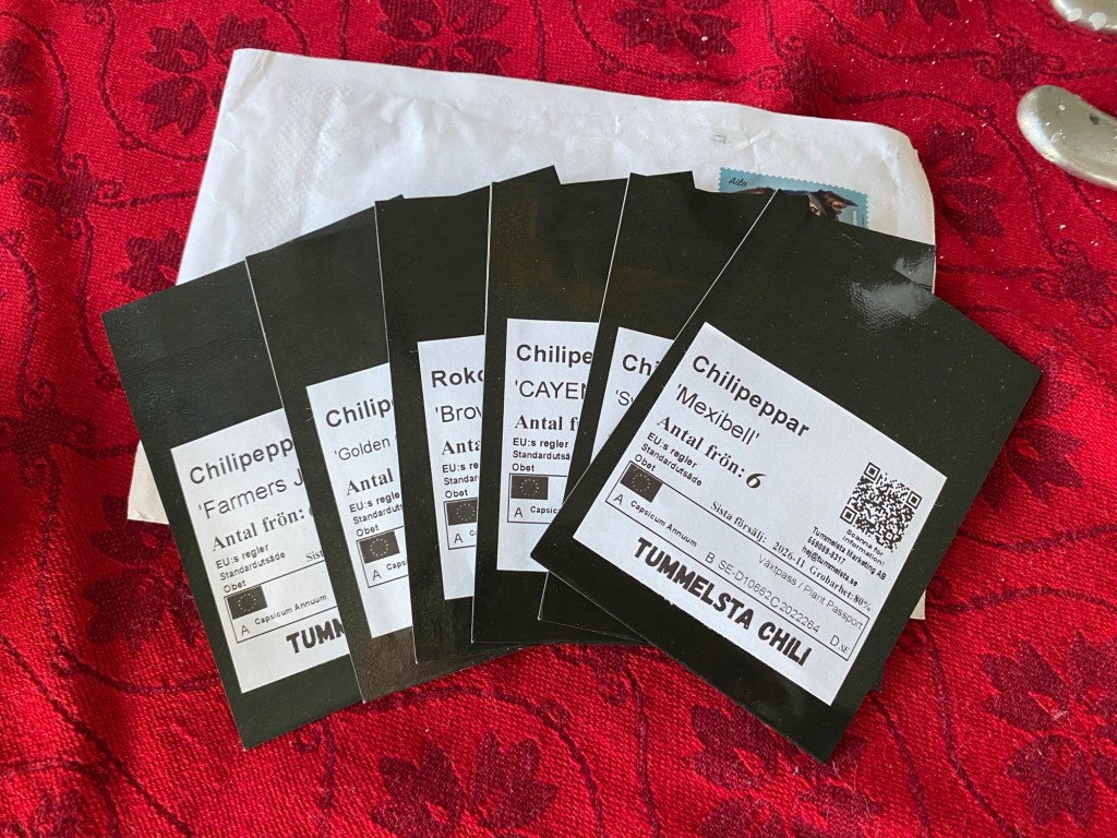 Skickade efter några nya sorter redan i november, blir spännande. Brukar bara sätta de jag har i mina chiliblandningar eftersom det blir så många ändå. Men i år behöver jag lite förnyelse. Och en del gamla var utarmade.