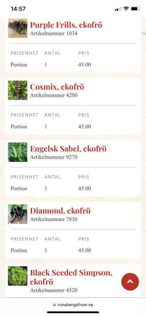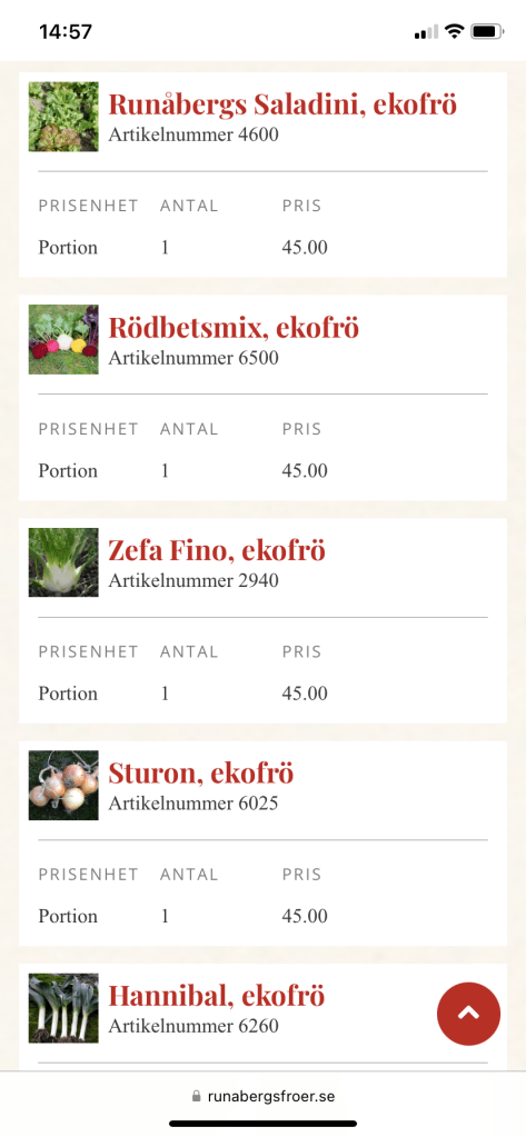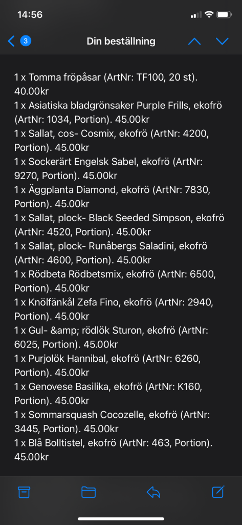 La, trots dålig koll, en ny order från Runåbergs fröer imorse, mest gamla trotjänare. Lökfröerna håller dåligt så trots att det blir många över efter sådd går de inte att spara till nästa år. Kan gå förstås, men att de inte gror vill jag inte riskera. Har jag redan varit med om!