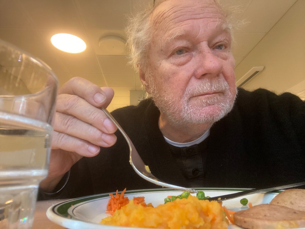 Lägg därtill eget rum med ständig tillsyn och 4-stjärnig service av snälla människor. Egen analog sängradio (P1!). Fri dusch, nattskjorta. Smörgås och kaffe. Middag: Rotmos och stekt korv med ärtor och rivna morätter.