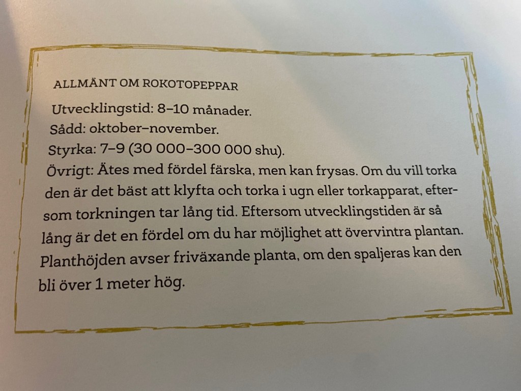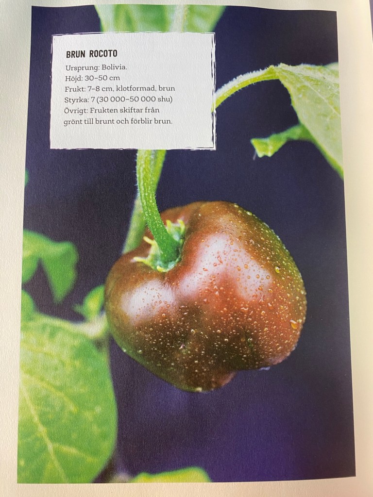 Och givetvis finns Brown Rocoto, den sorten jag satt, också med bland de 222 sorterna. Tror jag ska ägna resten av eftermiddagen med att färska upp mina chili-kunskaper. Även om det är i senaste laget…