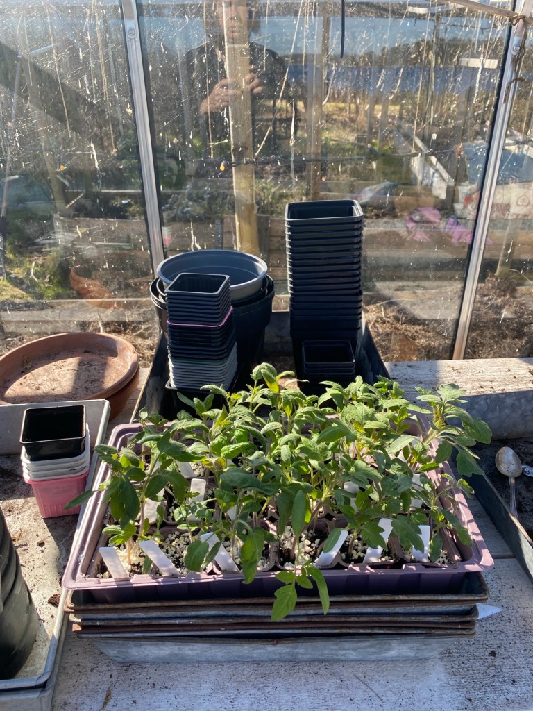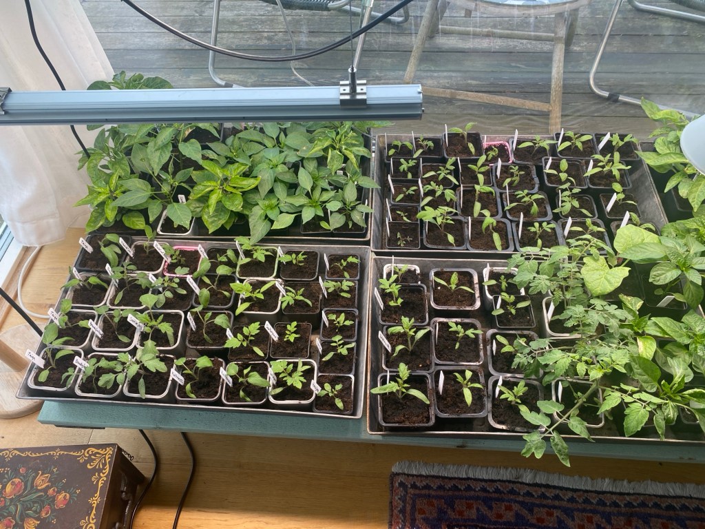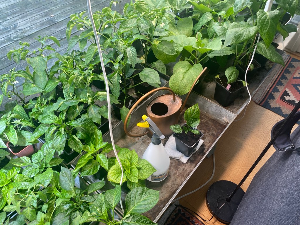 Trodde jag skulle ha sol och varmt i växthuset även idag, det hade jag inte! Har en massa chiliplantor som skriker efter större krukor. Dessvärre lär det bli trångt framför föntren trots att han förlängde plantbordet så det går hela vägen längs skjutdörrarna. Jodå, vi kommer ut ändå, vi har även en vanlig glasdörr vid sidan av så vi kommer ut!