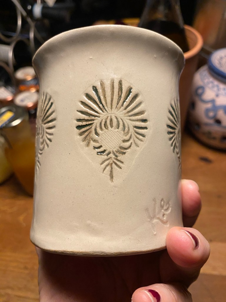 Fortsätta glasera, har en mugg kvar, och så göra en tallrik till. Gjorde en senast som står på tork. Hur de ska hinna brännas och glaseras vet i tusan. Men vi måste ju ha varsin frukost-mugg och tallrik. Får be Gith snällt om en en extralektion.