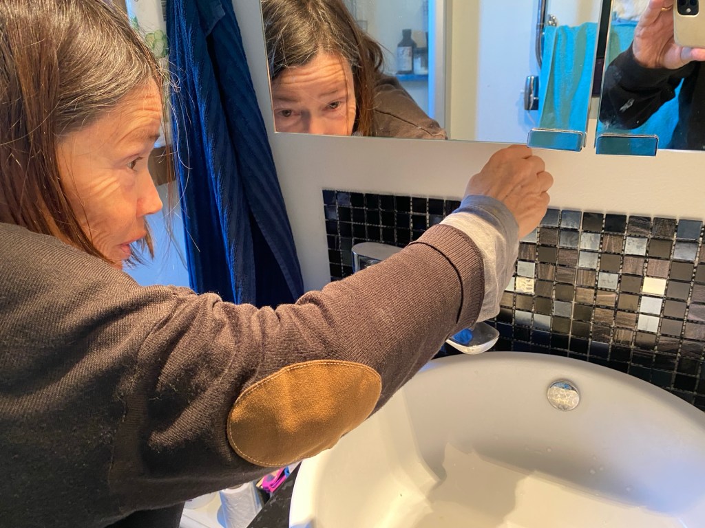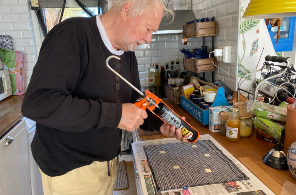 Hon: ja till slut tog vi tag i mosaiken vi köpte i samband med att det nya tvättfatet sattes in. Det var längesedan nu… tyvärr tyckte väl ingen av oss att det blev speciellt bra, ha ha. Men uppe är det.