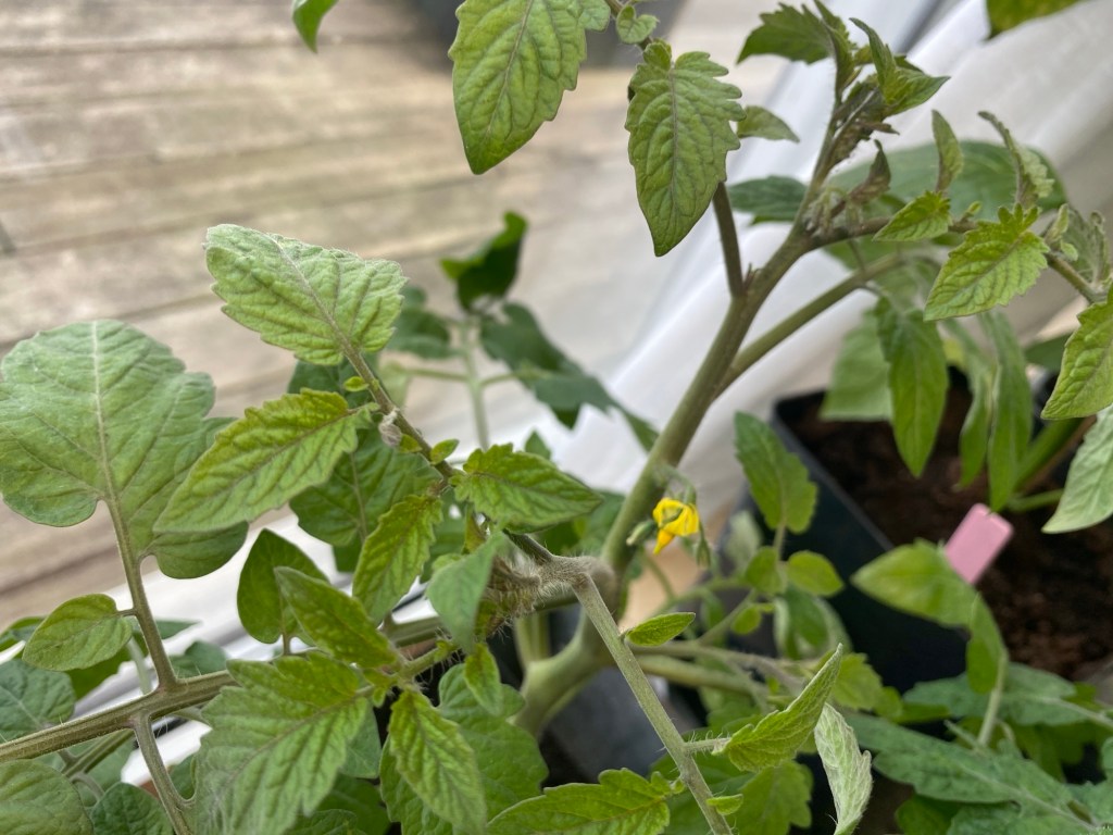 Och inne händer det grejer också! Espeletten har frukt och de första fyra satta tomatplantorna har knoppar. Och en blommar till och med.