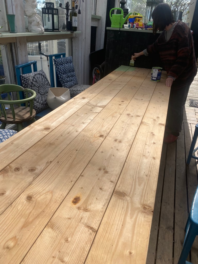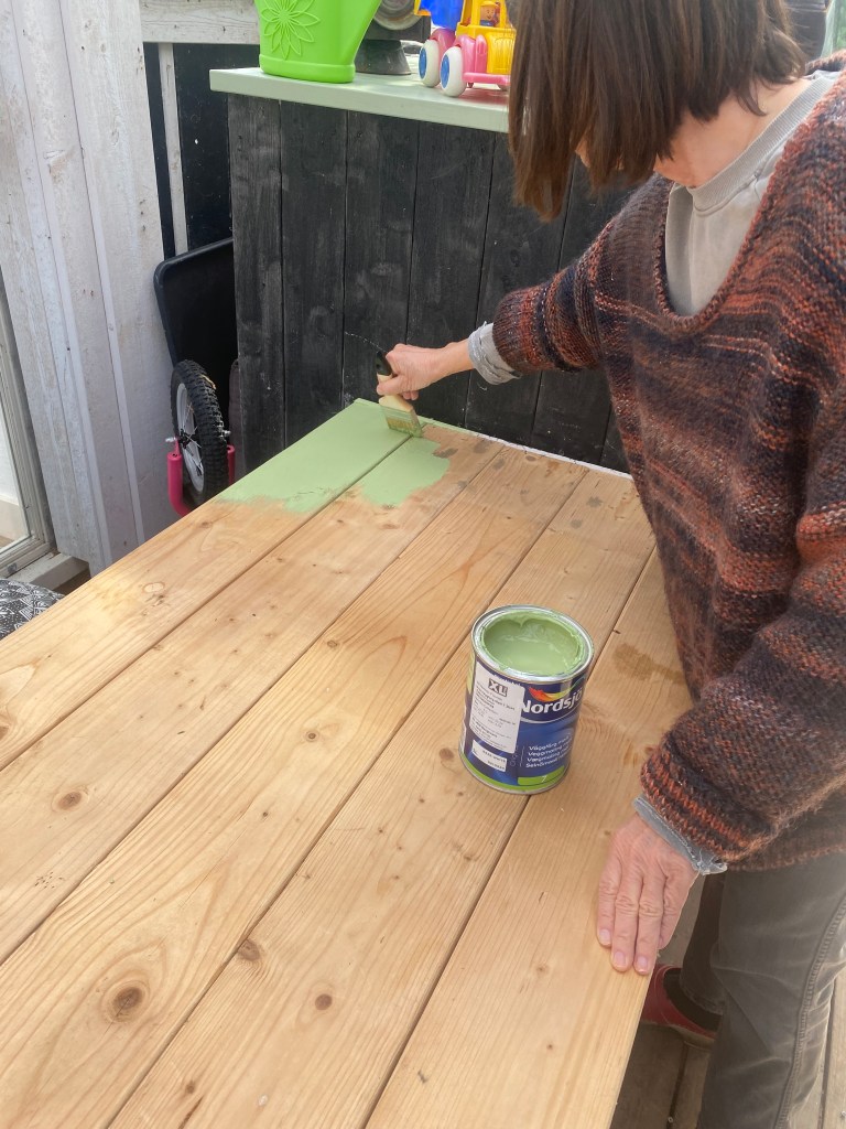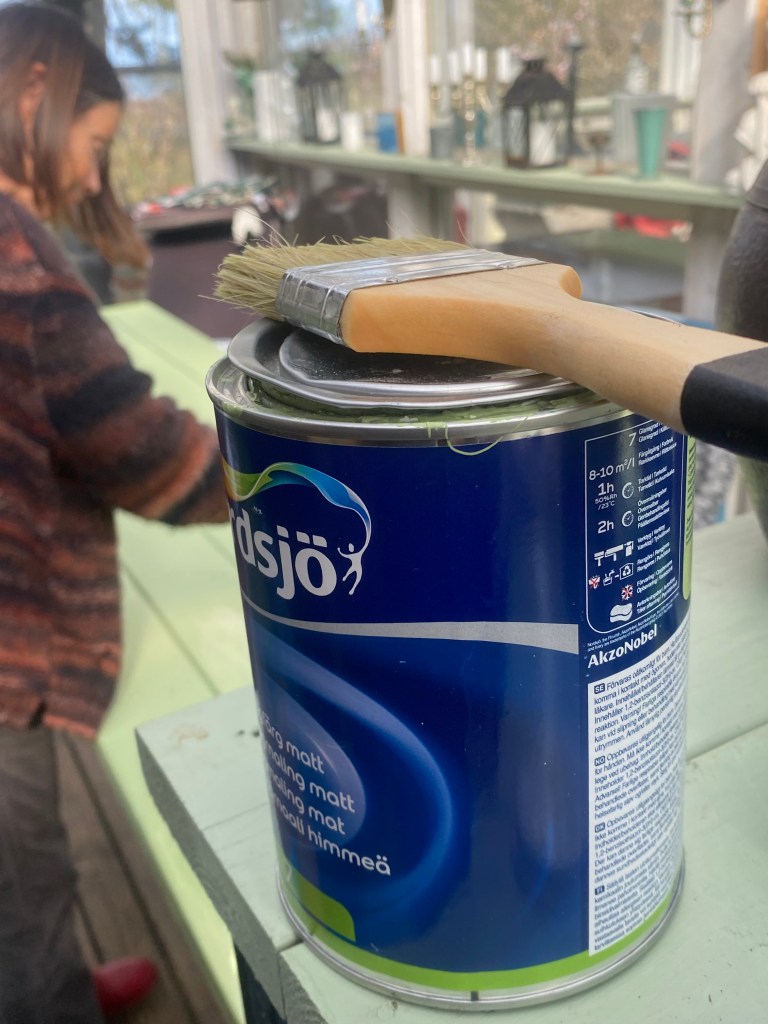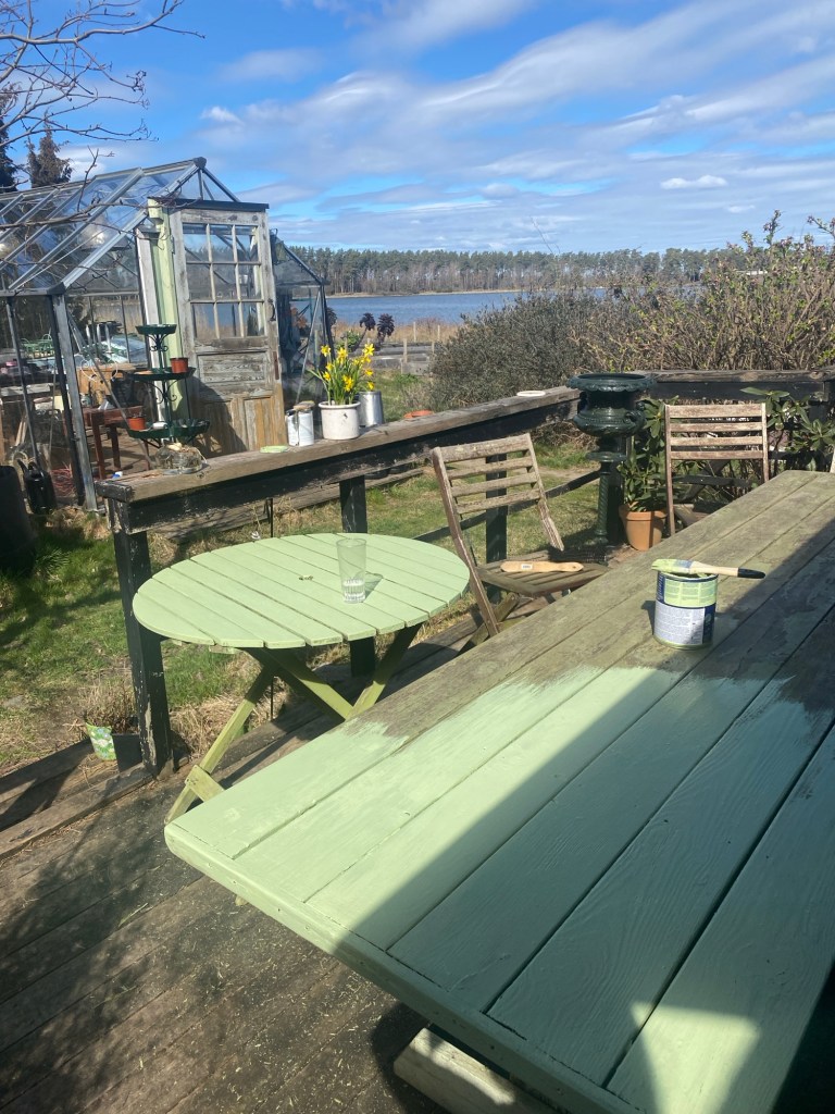 Dagen fortsatte i grönt. Utemöblerna behövde målas, vintern går hårt åt möblerna som står ute.