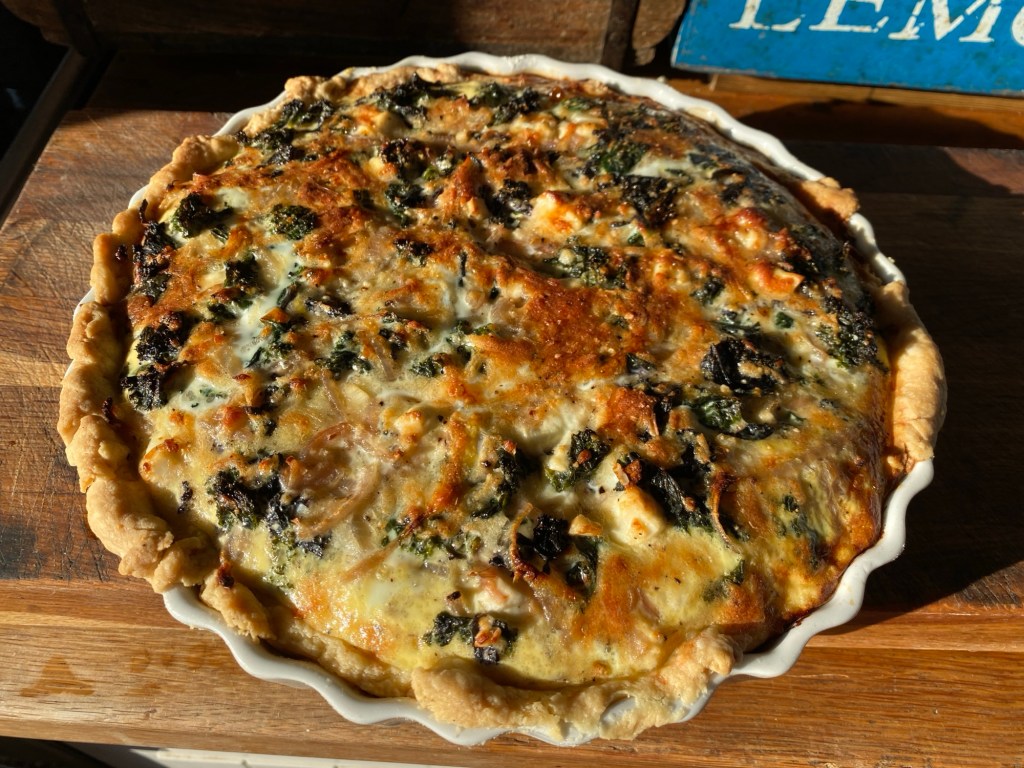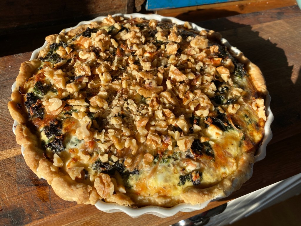 Blev en grönkålspaj med fetaost, lök och parmesan. Smakade av fyllningen, allt fick inte plats, den var himmelskt god. Sen skulle det på topping av valnötter också. Lite overkill kanske, de lär nog trilla av när vi hugger in…