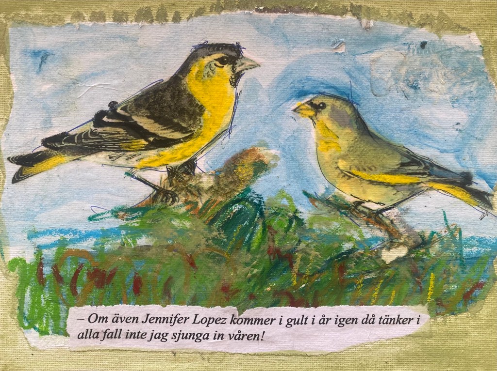 För att inte tala om småfågelvärlden. Till och med hos grönsiskan och grönfinken bakom Margaretas stuga är det de gula accenterna som ger fåglarna karaktär.