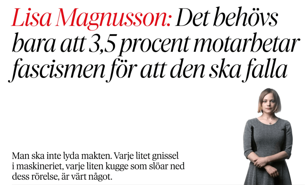 Vilket för oss till den godaste nyheten av alla: ”Erica Chenoweths forskning visar att när 3,5 procent av befolkningen väl aktivt motarbetar en regim så faller den, med få undantag. Och inte ens de mest hårdföra hantlangare i de mest brutala av regimer brukar vilja gå under med skeppet när de ser att det börjar sjunka. De har familj, och vänner, ett helt liv som väntar.