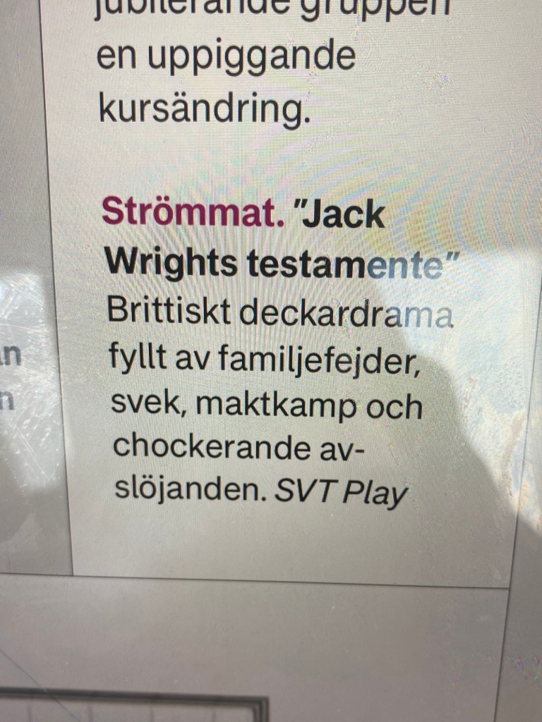 Tillbringade resten av eftermiddagen i soffan med en bok, därefter streamade vi två avsnitt av ”Jack Wrights Testamente” som jag läste tips om i dagens DN: