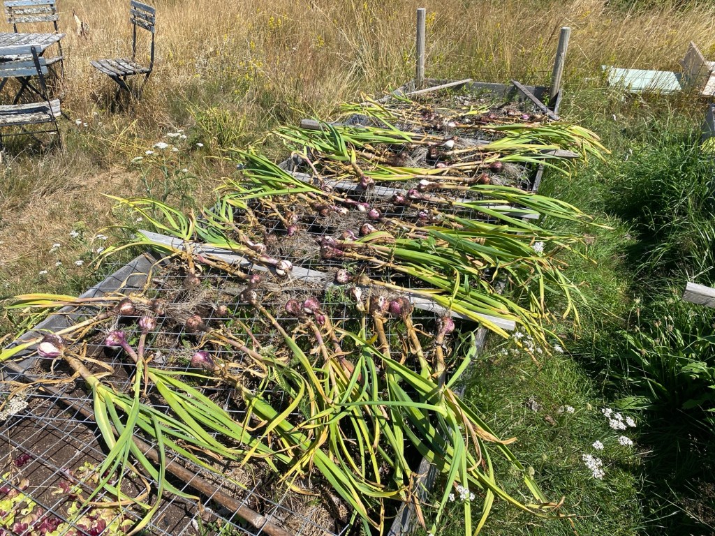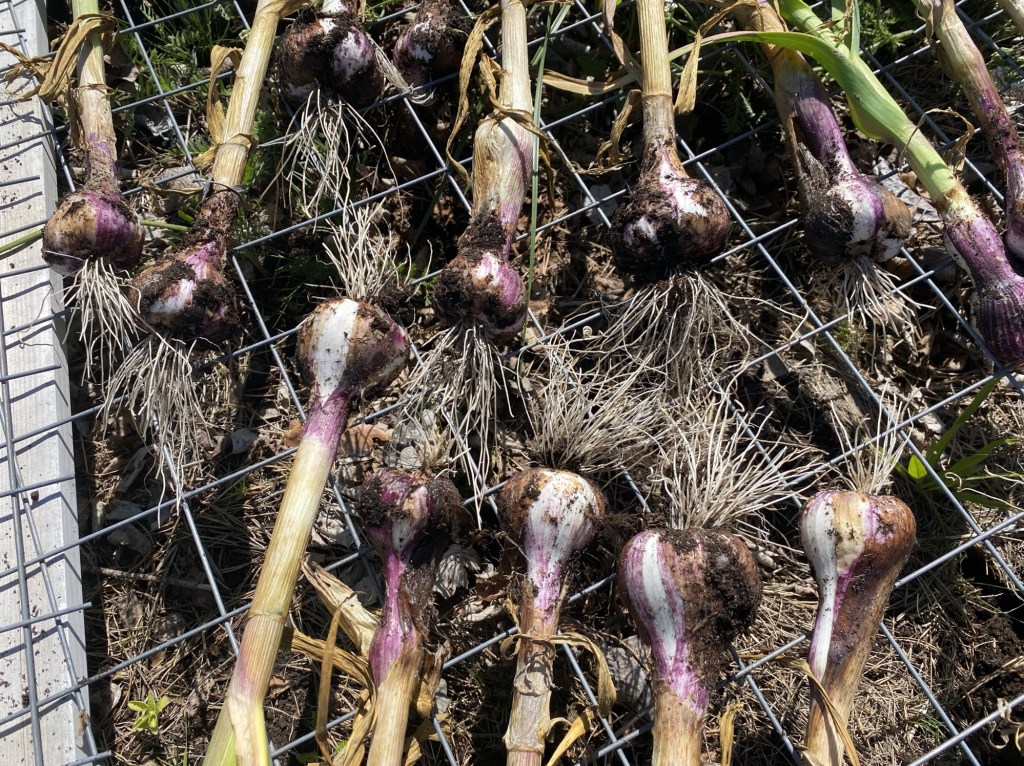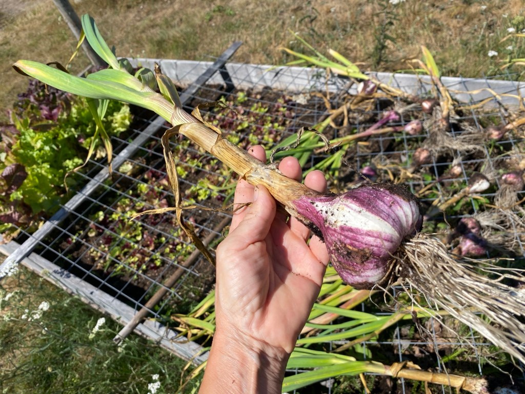Hon: Äntligen lyckades jag med vitlöken. Drygt 60 stycken är skördade, och alla är hyfsat stora, inte pytteklyftor som man knappt orkar skala.